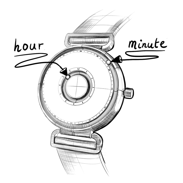 Forget about conventional watch hands. Instead, two magical spheres orbit to tell you the time. The inner sphere indicates hours, and the outer indicates minutes.